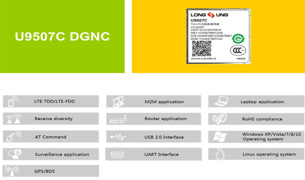 U9507C 是long8国际技术推出的一款 LTE Cat4 无线通信模块,内置丰富的网络协议,集成多个标准接 口;可以工作在 LTE-TDD/LTE-FDD/TD-SCDMA/UMTS/EVDO/EDGE/GPRS/CDMA/GSM/GPS/BDS 等多 种制式。